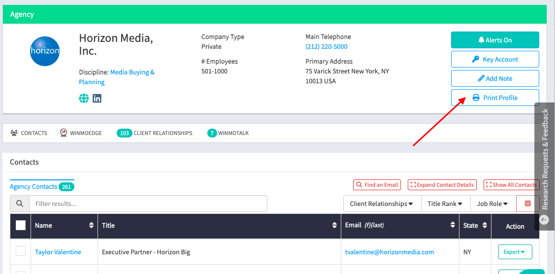 To do this, go to the top of any Brand/Company/Agency profile page. You should see "Print Profile" right underneath the buttons to enable Alerts, Set Key Accounts, and add Notes.