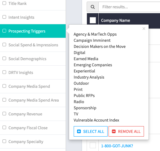 Simply click there and toggle the specific type of trigger (or triggers) you want to search for. Any advertiser that we've written about in the selected trigger over the past 90 days will appear in your results.